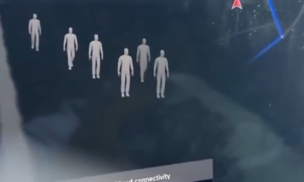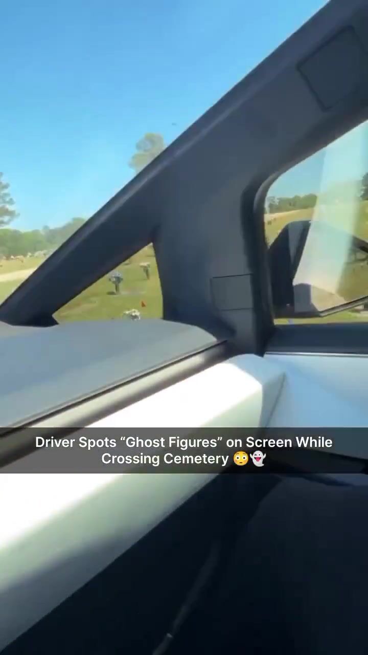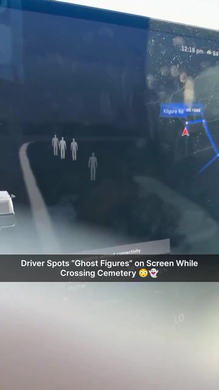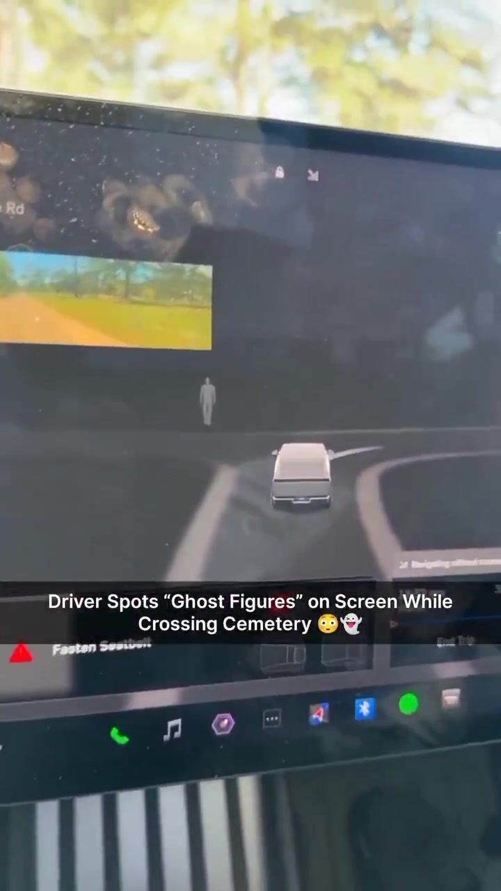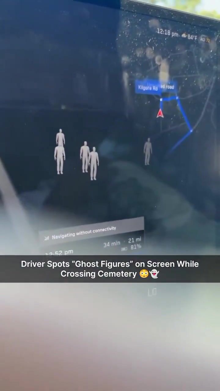 Dude is driving through a completely empty cemetery … and the infotainment screen starts lighting up with human figures walking around like it’s a parade.