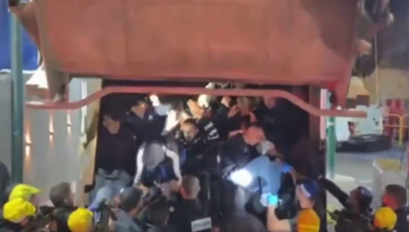 Garbage and liquid fell from the truck as its back was opened and the Palestinians were removed one by one.