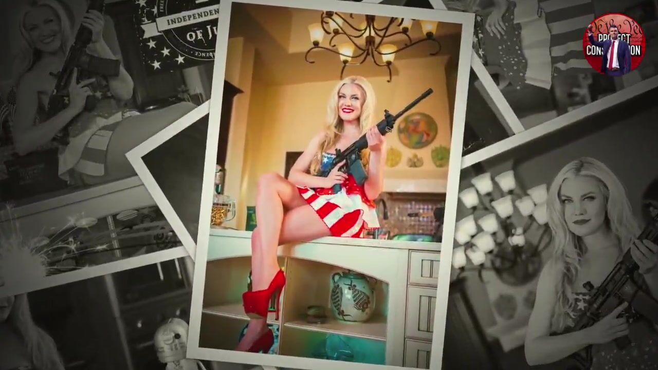 The Fake Patriotism: Erika is decked out in red, white, and blue, posing with a NAC Savage 1928A1 in a kitchen. But look at the configuration. Look at the energy.