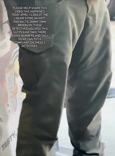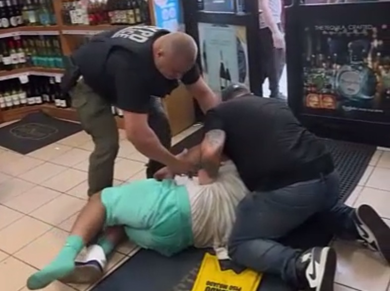 The man was punched and had his head slammed into the counter window of the liquor store as two cops — one dressed in an NYPD-issued vest and badge and the other in plain clothes —held his arms back, the video shows.