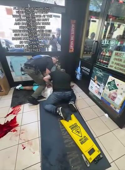 The plain-clothes cop kneed the man in the midsection multiple times before he slammed into a shelf of glass bottles, which shattered, causing the man to bleed, the video shows.