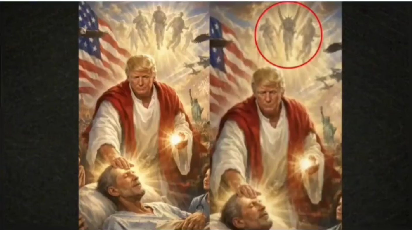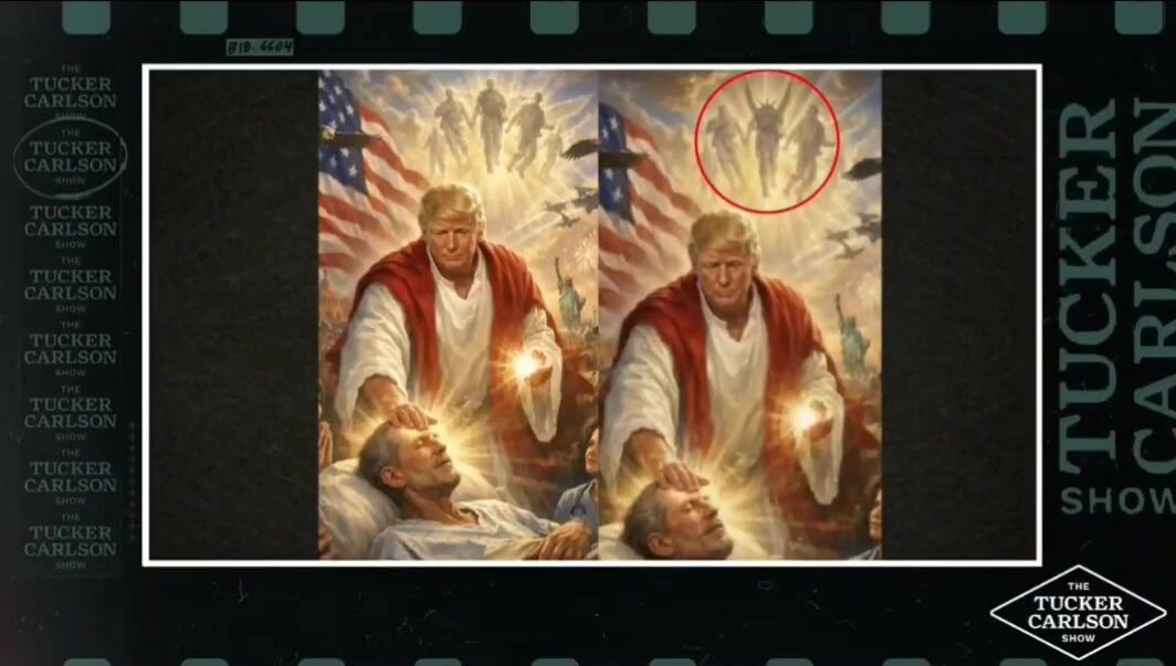 Is our president openly worshipping Satan? Tucker Carlson alleges that the viral image of Donald Trump portrayed as Jesus was deliberately altered, with what should be a soldier in the background appearing instead as a winged demonic figure.