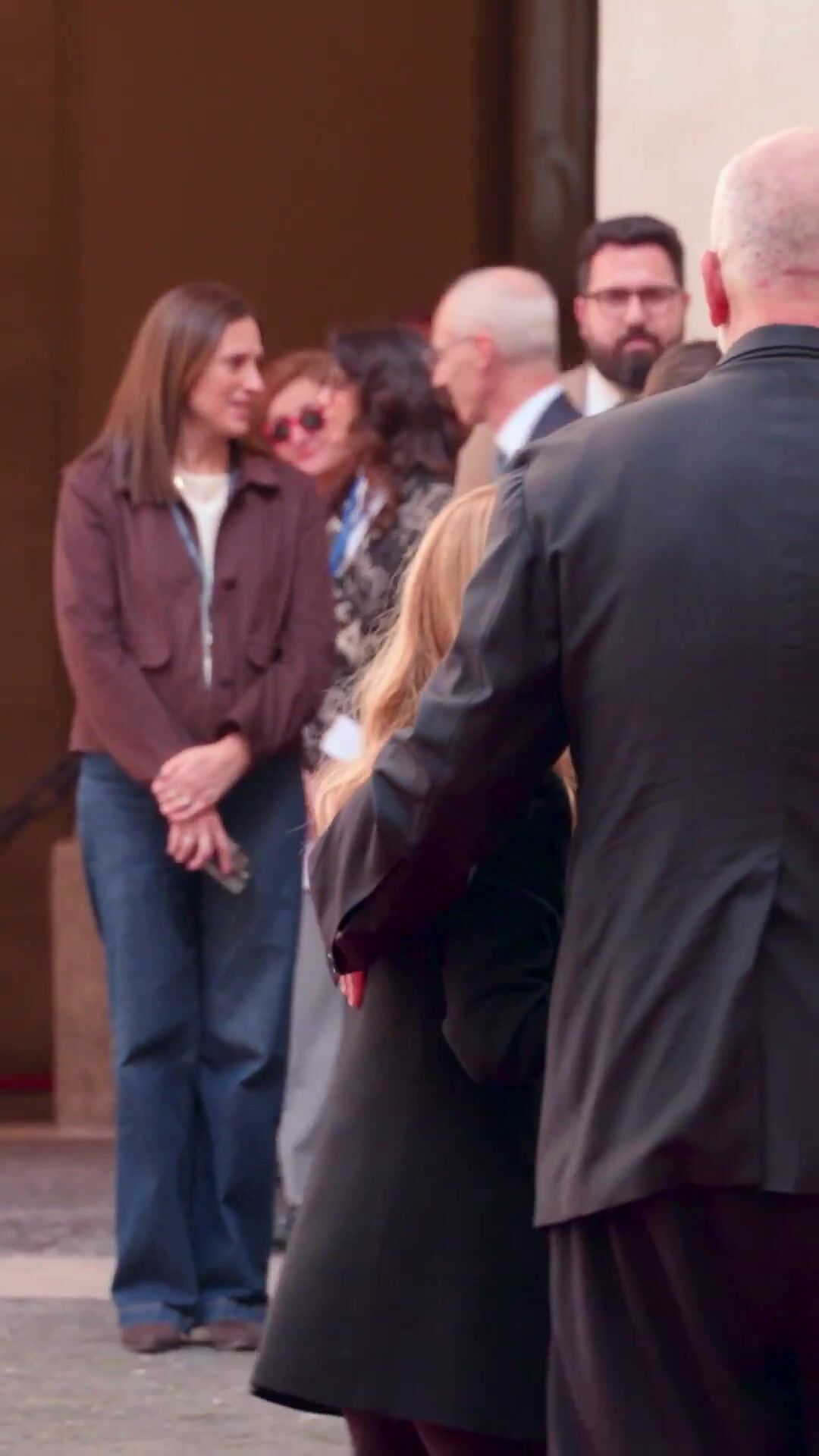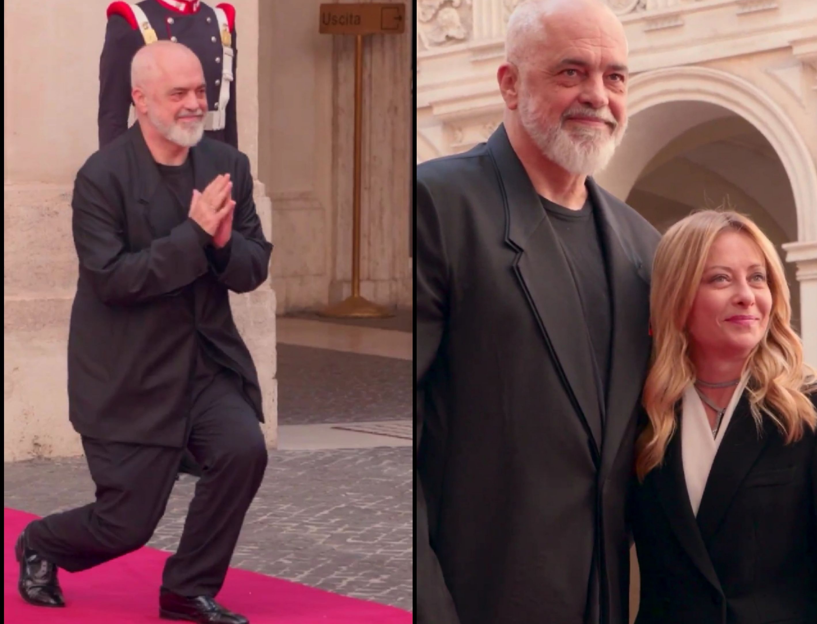 Albanian PM Edi Rama kneels before Italian PM Giorgia Meloni