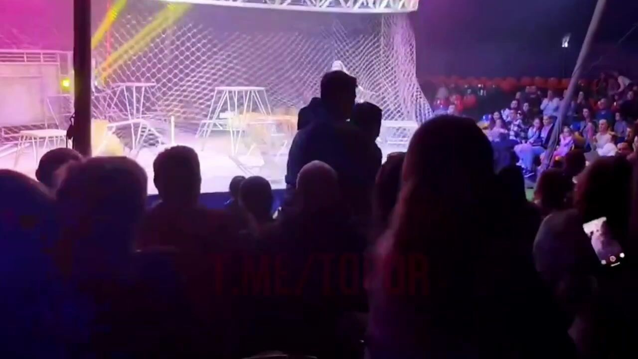 A tiger escapes from its enclosure due to the collapse of a safety net during a circus performance in Rostov-on-Don, Russia, causing panic among the attendees.