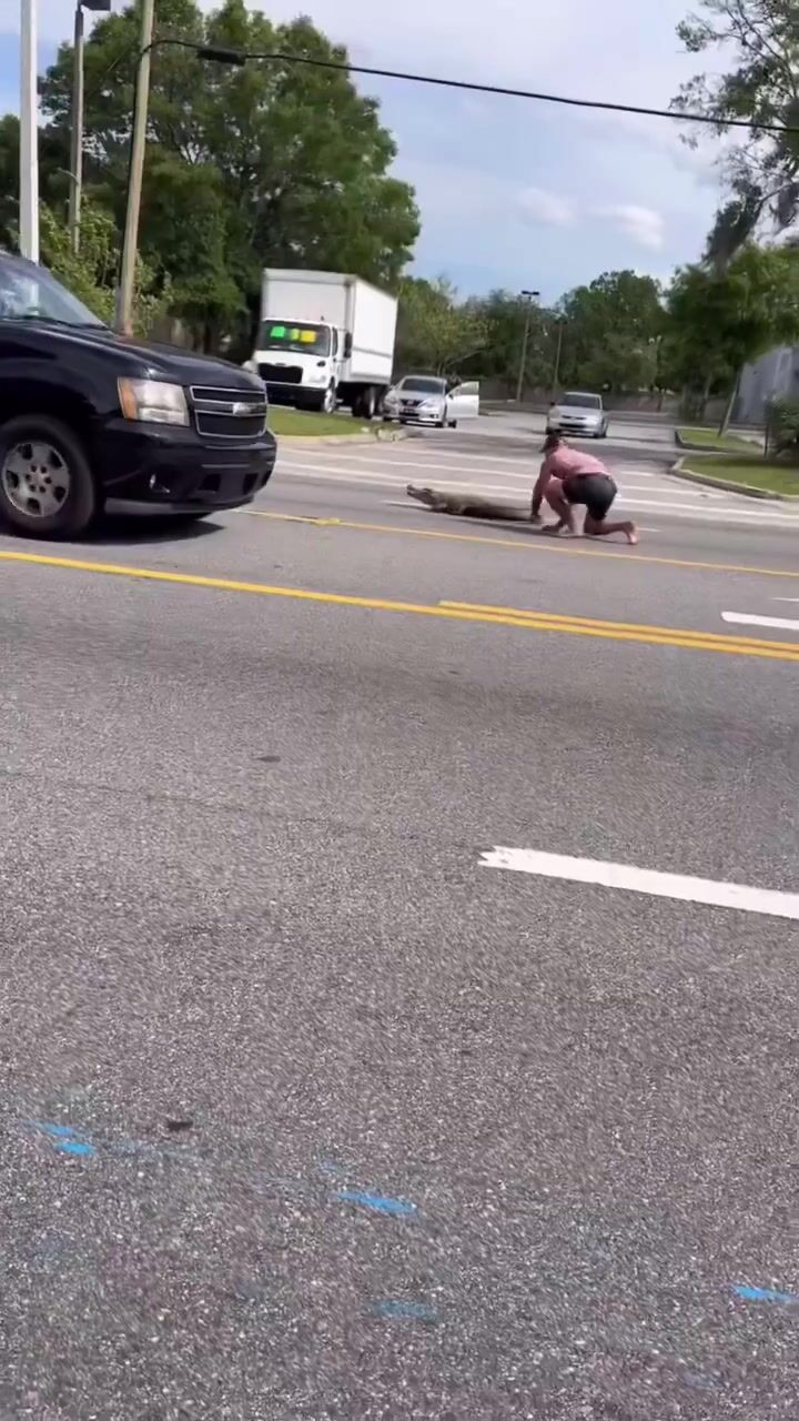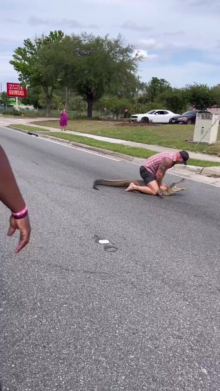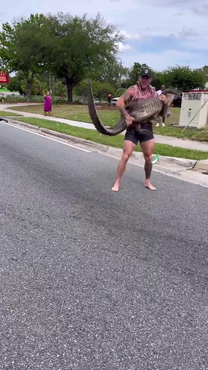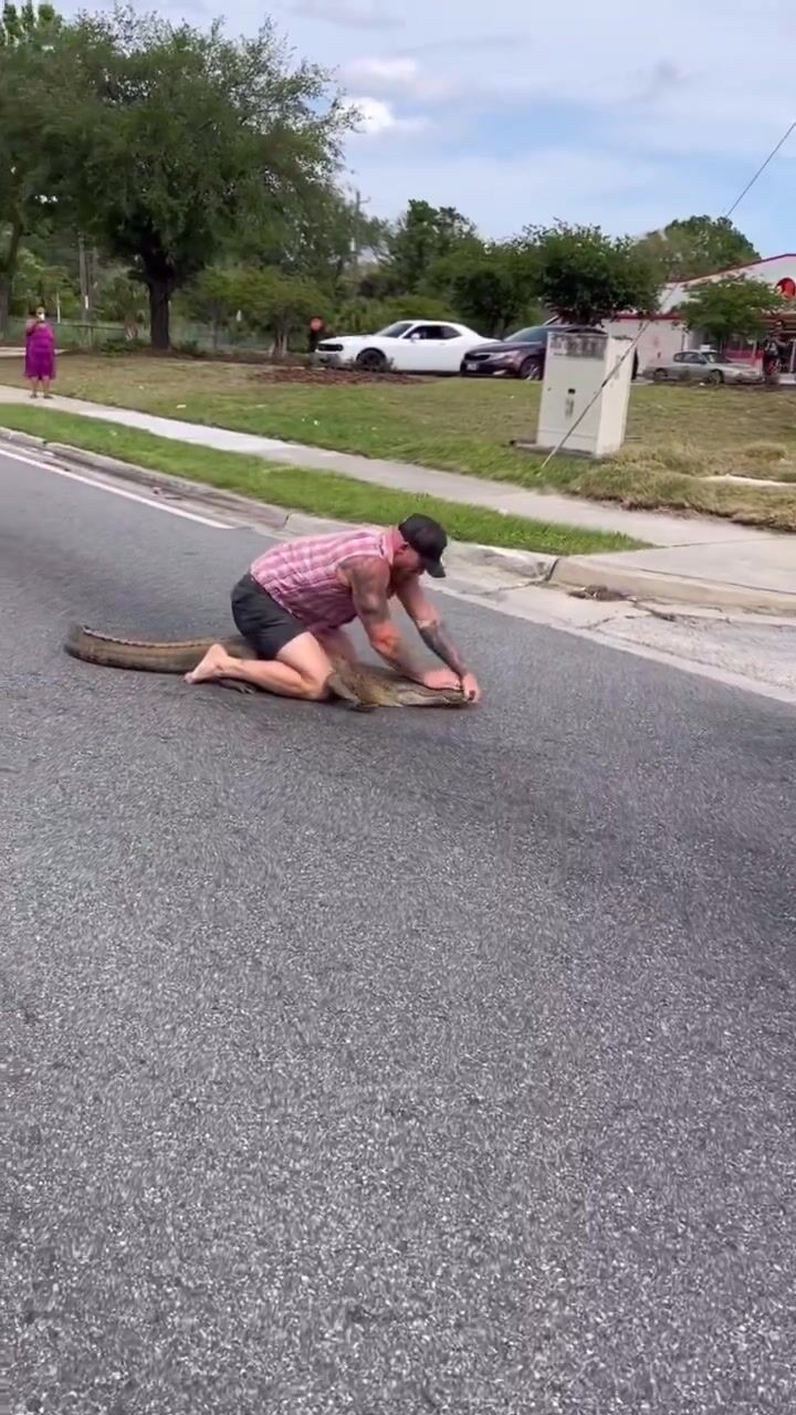 Barefoot on asphalt, casually wrestling an alligator with his bare hands, picking it up, and walks off while carrying it. Incredible