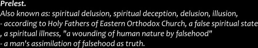 Prelest. Also known as: spiritual delusion, spiritual deception. • a false spiritual state, a spiritual illness, "a wounding of human nature by falsehood" • a man's assimilation of falsehood as truth. Marian Apparitions, Stigmata & Locution
