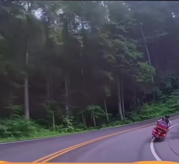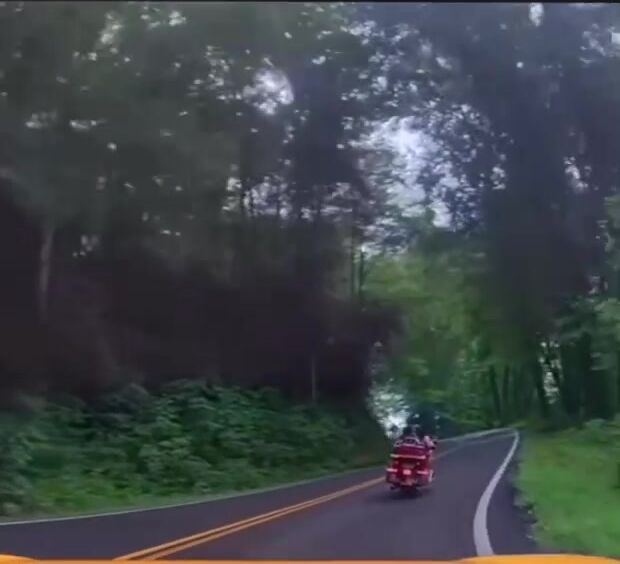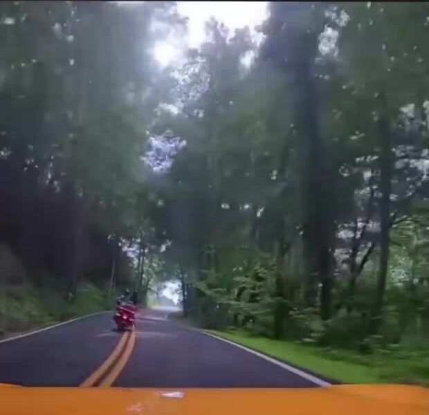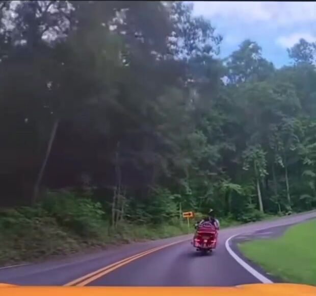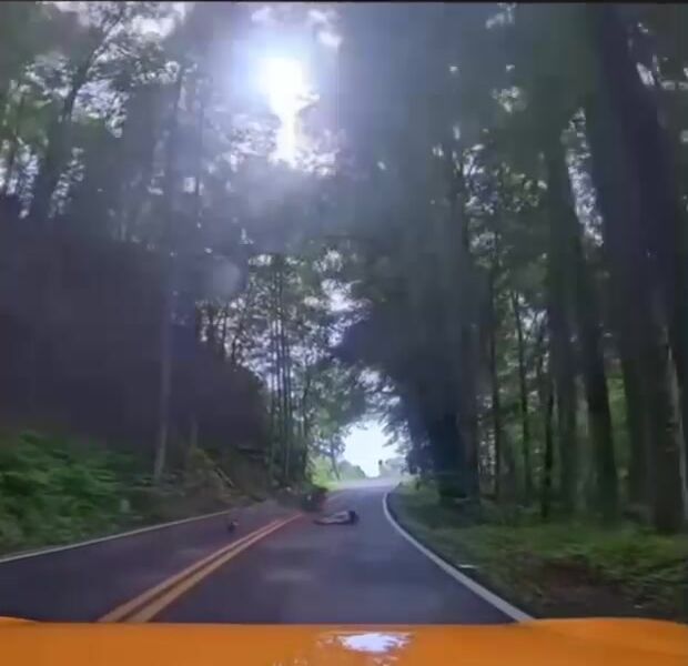 Couple on a road bike hit a slick spot and eat it. Riding the paint, no leather, screams new rider. Just cuz you can afford a Harley don't make you a Hell's Angel