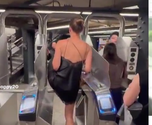 «If she is not a he, that tall leggy blonde that that just stepped over the turnstile got good back.»