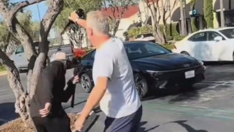 Man throws wine on multiple masked men after they started randomly filming people